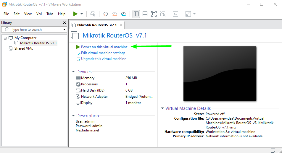 بعد از وارد شدن میکروتیک به شبیه ساز با همچین صفحه ای مواجه میشید که باید روی گذینه Power on this virtual machine کلیک کنید